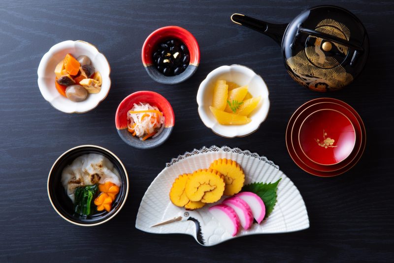 伊達巻き、黒豆、かまぼこ、紅白なます、数の子、雑煮、筑前煮