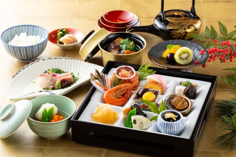 - 九つ切り御祝肴(数の子、紅白なます、紅白蒲鉾、鰤照り焼き、金団、海老艶煮、姫鮑旨煮、黒豆、子持ち鮎と野菜)