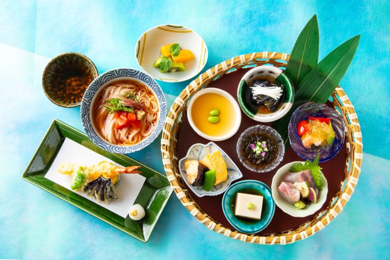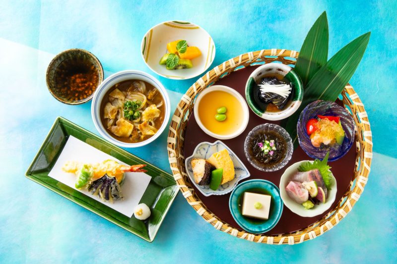 - 籠盛り七種(お造り二種盛り、水雲酢、焼魚と玉子焼き、茄子揚げ浸し、冷やし茶碗蒸し、季節の豆腐、夏野菜のゼリー掛け)