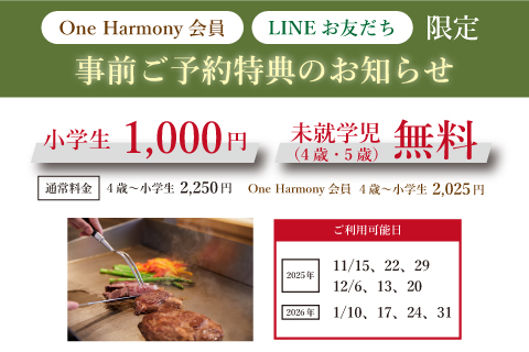 【One Harmony会員様】または【LINEお友達登録済の方】は、事前予約で 小学生以下のお客様 が オトク になります💡